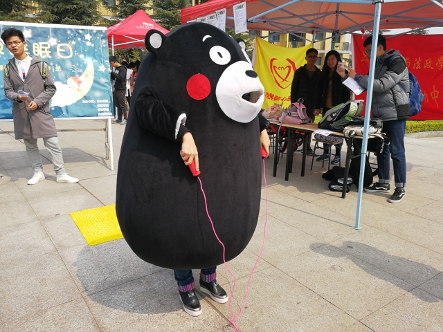 中午12时整,心理自助中心所有成员到达了指定位置。在进行了简单的场地布置以及物品准备后,活动正式开始。负责分发传单的同学穿着布偶在广场四周走动宣传,用新颖的方式引来了许多许多同学的关注。宣传成员声情并茂的为同学们讲解了世界睡眠日设立的背景和目的,并且介绍了一些良好的促进睡眠,调整睡眠的小窍门。在记着随机采访时发现,多数同学都有熬夜的习惯,并且或多或少存在一定的睡眠问题。有同学在听完介绍后表示,“熬夜是不对的,不但工作学习效率不高,同时影响第二天的正常生活”。同时,成员还在自助中心的宣传帐篷处开展了按摩垫上跳绳的游戏,并播放音乐活跃气氛。同学们饱含热情参与其中,场面热闹非凡。最后,心理自助中心成员合影留念,完成了此次宣传活动。