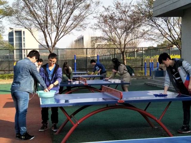 下午两点,同学在梅三宿舍楼集合完毕,并到达梅三宿舍楼与梅二宿舍楼之间的单双杠以及操场旁的单双杠进行清洁。清洁之前,同学们被分为两组,一组负责擦拭运动器械,另一组负责给水盆换水。在清洁过程中,有同学表示,运动器械上有一些难以擦拭干净的胶带,尤其是操场上的运动器械上残留胶带的现象更为严重,希望同学们能好好爱护学校公物,保持公物整洁。随后,同学们前往操场旁和网球场旁的乒乓球台进行清洁,并清除干净乒乓球台上的杂物。在整个清洁过程中,同学们相互协作,不嫌脏累,还时刻留意地上有无废弃垃圾,并将其一一拾起并扔进附近垃圾桶。经过两个小时的辛勤劳动,活动于四点圆满结束。