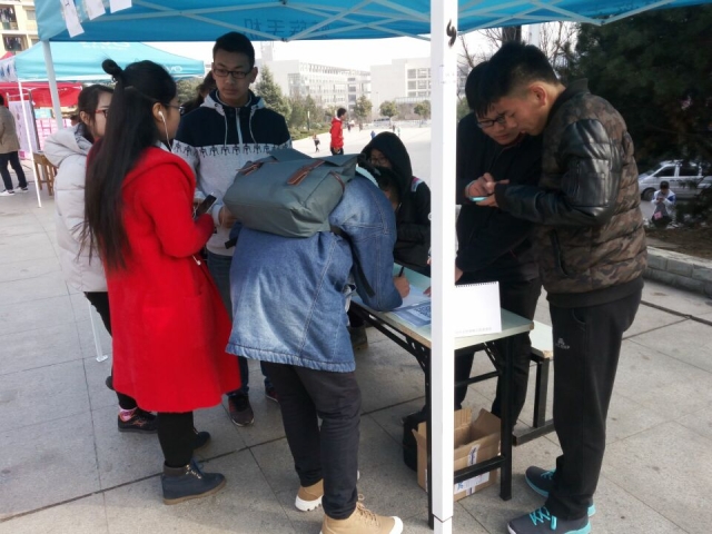 11日上午11点整,志愿者们在团支书徐鹏的带领下,将帐篷、桌椅等物品搬至二食堂广场。1130分,活动正式开始。此次志愿活动中,由徐州市爱护动物志愿者协会出资印制了带有可爱流浪小动物的台历,安全15-4团支部的志愿者们对台历进行义卖。本次活动的主要方式是以固定摊位和流动摊位相结合的方法进行义卖。台历标价,但不拒绝高价慈善义卖的行为。在工作过程中,志愿者们不停地在广场上给来往的同学们讲解此次义卖活动的目的。而在听完志愿者的讲解后,同学们往往会停下脚步,前来购买台历,奉献自己的爱心。除此之外,志愿者们还积极为同学们介绍徐州市爱护动物志愿者协会,增加同学们对流浪小动物的关注度,旨在让更多人参与进来,为小动物们送去温暖。下午1点,结束了当天的志愿活动。经过两天的努力,此次志愿活动共义卖台历35本,筹得资金700元,由轩吴凡同学悉数转交给徐州市爱护动物志愿者协会。