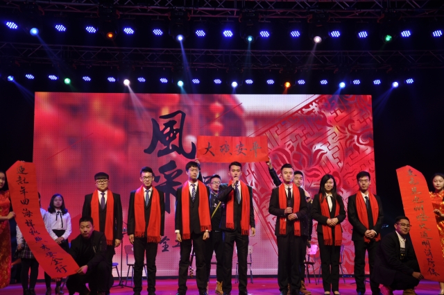 七点整,晚会开始。晴天艺术团带来的舞蹈茉莉花开一开始就给观众带来一场绝美的视觉享受。接着,校领导为年度获奖员工和团体颁奖,肯定了他们在2016年付出的努力,并以此鼓励他们再接再厉,在新的一年中再谱人生华章。随后,总务部演奏了一段独特的锅碗瓢盆交响曲,随后各个学院的表演开始。安全学院的代表自弹自唱,为全场献上一曲《年轻的模样》串烧民谣,歌唱出青春的悲与欢,唱进人们心中,全场掌声雷动。表演结束后,安全学院的主席团登台向全校师生送出新年祝福,并献上一副对联以迎接新年。安全学院结合学院特色创作对联,不仅表达了对大家新年平安喜乐的祝福,而且显示了学院专业的独特魅力。