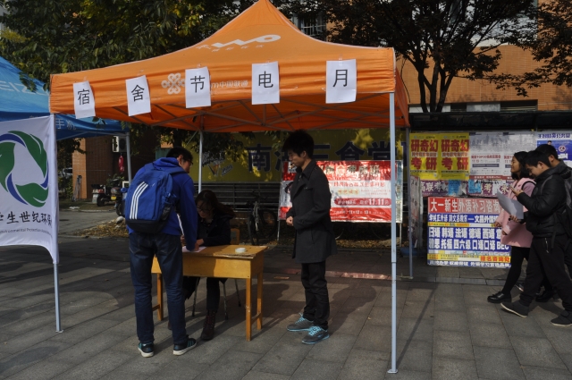 宿舍楼是员工活动最频繁、用电量最为集中的区域,因此举办此活动,通过统计报名大寝一个月内的用电信息,按人均用电量排名,选出节电宿舍。中午12:30,三食堂门口人头攒动。同学们看到“宿舍节电月”宣传棚便前来了解情况,并纷纷表露出对此活动的兴趣。安全学院生活部的成员们拿着宣传单,细心给路过的人们讲解活动细节,鼓励大家积极报名参加,并现场填写宿舍信息。在鼓励参与的同时,生活部的同学们还提供了一些节电小常识,呼吁大家从校园点滴做起,养成节电的习惯,为保护环境尽自己的一份力。