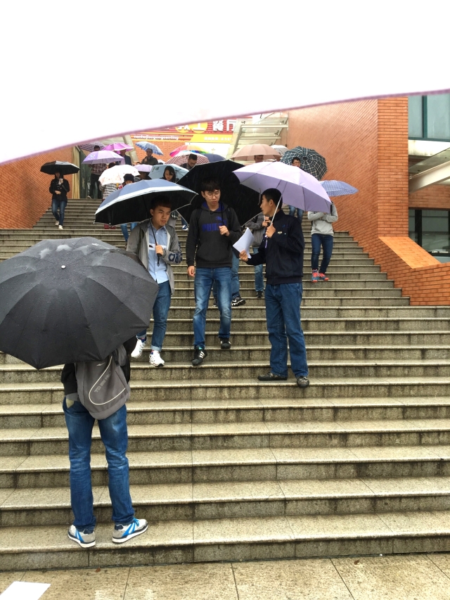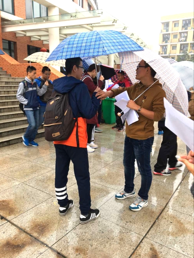 中午12点,创新创业中心的同学们在二食堂广场准备就绪。首先,负责人向工作人员简单介绍活动流程,并对宣传与报名方式进行详细说明。接下来,工作人员两两分组,向过往行人发放传单。滂沱的大雨挡不住同学们的热情,大家对大赛表现出浓厚的兴趣,积极了解相关消息并踊跃报名。
