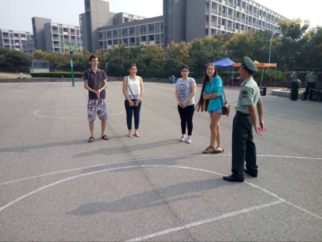早上7点,四名国际交换生到达梅南运动场。这时,新生们正在进行站军姿、跨立、齐步走等基础训练。为了不打扰同学们训练,郑文奇老师先与交换生们进行交谈,并简单地介绍了军训的一系列内容,以及军训的一大意义在于使同学们依靠集体,关心集体,维护集体,不断克服不良行为和习惯,不断克服个人主义,不断塑造集体主义思想。接着,在新生们的休息时间,交换生与大一新生进行了面对面交谈,各自表达了对军训的理解以及对自身在安全学院未来发展的规划,大家都受益匪浅。由于时间限制,短暂交流后训练继续进行,但是双方都表示以后要多多进行交流。