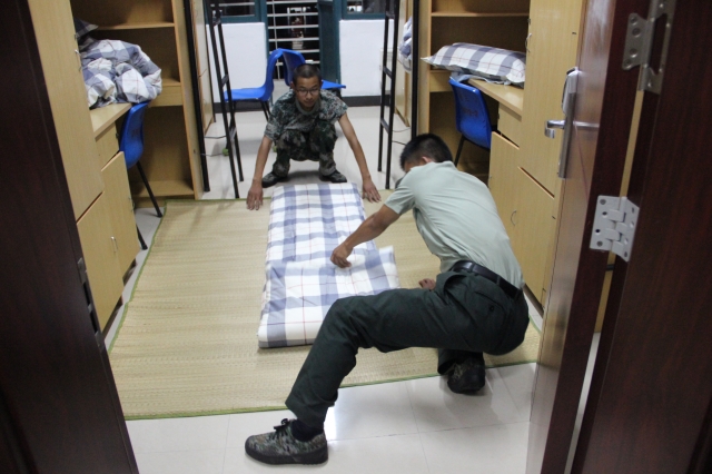 晚上7点半,负责军训的教官在辅导员郑文奇老师的引领下到达男生宿舍。为了确保每一位员工都能够清晰、直观地观看整个叠被的全过程,教官要求各寝室带一床被子和一张席子到楼道,边叠边讲解。教官首先对叠被的意义及关键点进行了阐述,并强调一床优秀的被子必须经过量、掏、擀、折线等过程,而且每一步环环相扣,必须仔细认真,确保每一步都有坚实的基础,随后教官对叠被的过程进行了演示。同学们围做一圈,紧紧盯着教官的每个动作,生怕漏掉任何一个细节,同时从旁协助教官,以便进行更好的学习。在叠第二床被子时,每个排又换一些同学靠前再次进行学习,保证同学们能高质量地完成叠军训被的任务。随后,各寝室积极投入叠被子战斗中。