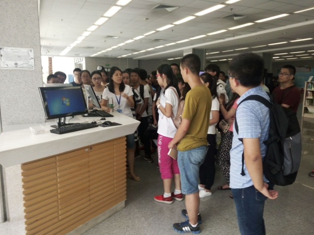 上午十时,新生在梅苑餐厅前集合,员工会成员组织各班站好队,清点好各班人数后,带领他们前往图书馆。在图书馆门口,图书馆讲解老师表达了对16级新生的欢迎。随后,每位老师带两个班级进入图书馆。讲解老师耐心地讲解了图书馆的内部设施,借还书的步骤,和图书馆的开馆时间及一些注意事项。同学们也显示出浓厚的兴趣,积极地向老师提问,老师一一地回答了问题,并鼓励同学们经常来图书馆看书学习。