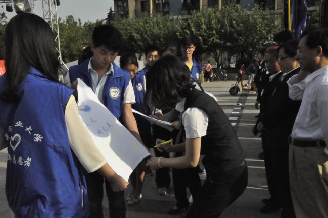 下午四点十五分,安全学院志愿者协会的同学们就来到了活动现场并特意带上了安全学院院旗,其他各个学院的同学们也陆陆续续来到了现场,现场气氛活跃。四点三十分活动准时开始,在主持人热情地介绍之后是积极向上以及青春向上的开场舞蹈,围观的观众也渐渐多了起来。随后是校团委陈靓副书记发表讲话,紧接着后勤服务集团杨素明副总经理等领导也先后发表感言,他们表示对青协的活动充满了信心,并对同学们之前的工作进行了充分的肯定。安全学院青年志愿者协会的同学们积极参与到活动中来。活动持续进行,志愿者代表倡议之后进行了自行车管理活动的启动仪式和五月青春主题文化衫标语征集活动开始仪式,仪式十分成功,同学们纷纷表现出了参与活动的热情和积极性。下午五点二十分左右,活动正式结束,主持人宣布仪式结束,由志愿者组织开展“快闪活动”。各学院青年志愿者协会主席以及老师进行了合影留念。