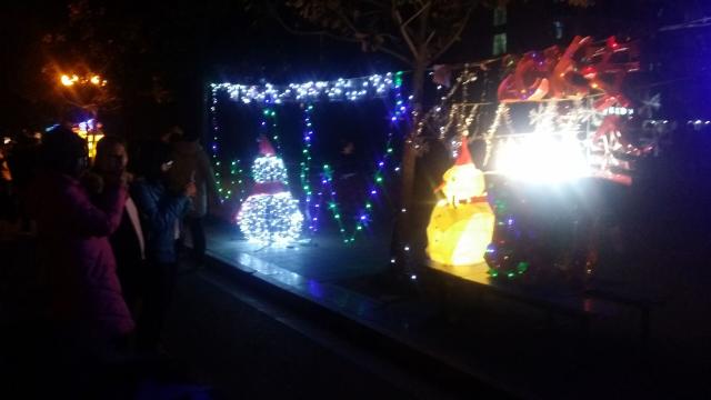 下午4时,所有负责花灯的人员悉数到达二食堂广场,开始在安全学院所在的区域布置。他们先是摆出了一个雪人花灯,这个雪人花灯圆挺挺的白色肚子再加上带有圣诞帽的脑袋可谓萌态十足。尔后他们又拿出了三个贴有红色卡纸的猴子花灯,用胶带固定它们使其成为一个带有顶盘的三角形状,然后上面再放上几个桃子花灯,此举也切合了猴年的到来。之后他们又摆出了“2016安全”的字样,预示着新的一年安全将会更加辉煌。待到最后,他们开始用小彩灯修饰花边,使其看起来更加绚丽多彩。尽管寒风刺骨,但经过大家的努力,下午五点,花灯已全部布置完毕。