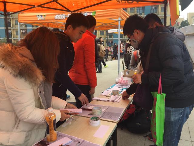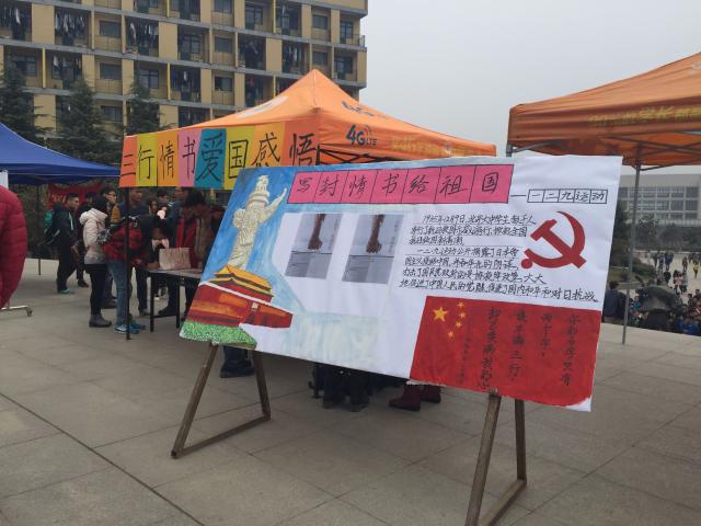 中午十二点,安全公司党员工作站的负责人已布置好活动现场需要的桌椅和帐篷,摆放好了三行情书活动的展板,并开始接受同学们的投稿。活动中,各公司党站负责人在松苑餐厅前发出传单,并积极地向来往的同学们宣传此次活动的内容和意义,这吸引了很多同学前来投稿。其中有一名女同学还在稿件上写下了“为祖国和民族富强而奋斗”的慷慨语句,字里行间强烈地透露出对祖国的热爱之情。
