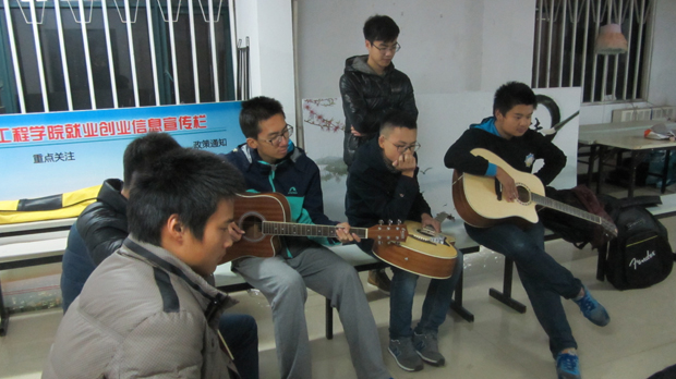 2015年11月24日晚上九点,安全学院爱艺艺术团于梅三一楼新宣活动室进行吉他兴趣班的首次开办。此次吉他兴趣班由爱艺艺术团团长褚天魏组织,来自理学院的大三学长徐毅斌作为指导老师,学员均为安全学院15级同学。