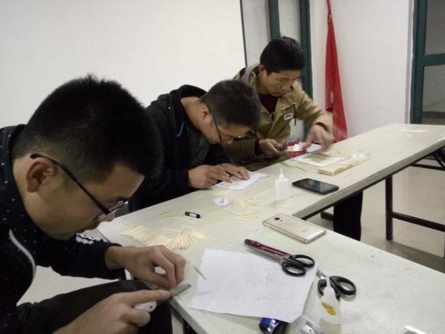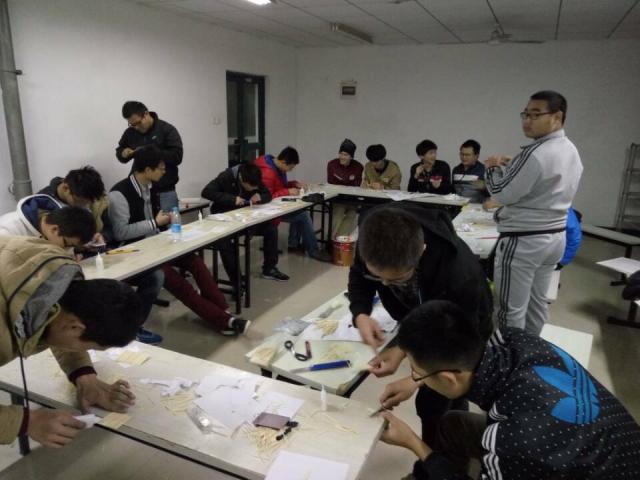 晚上9点,培训正式开始。此次活动主要是利用牙签以及胶水做一个鸡蛋的保护结构,使其自由落体而不被损坏。首先,科协部长就模型的搭建进行讲解,他介绍了关于一些成功的技巧并给出了相关建议。讲解完毕后,会议进入讨论时间。在会上,同学们都提出了许多创新的想法,画出了基本结构并共同分析讨论其可行性。经过激烈的讨论,各组成员确定了最终方案,正式开始模型搭建。小组成员们用胶水将牙签进行粘贴,粘贴成机翼的形状,并将其组装起来。经过一个多小时的制作,各组模型的雏形便大致完成了。