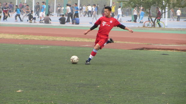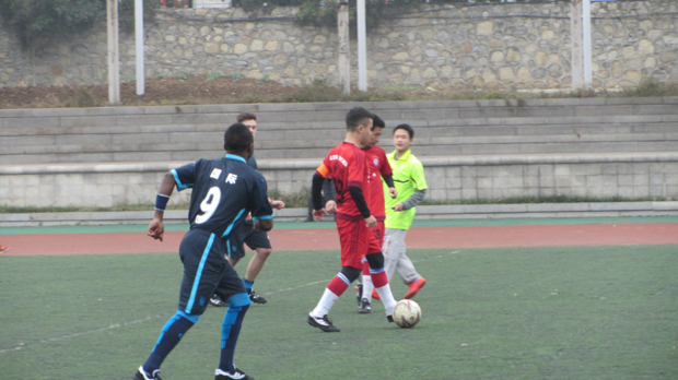 下午1时,安全学院足球队早早来到梅南运动场,为接下来的比赛进行提前热身,以防在比赛中受伤。在训练中,他们围成一个大圈训练传接球。随后,在裁判员的指挥下,双方运动员入场,安全学院运动员围成一个圈加油打气。2时30分,安全学院与国际学院的八强淘汰赛开始。上半场开始,安全学院足球队开始突破对方的防守,多次带球进入对方禁区。随后,国际学院开始反攻,安全学院足球队队长丹尼尔组织球员转攻为守,指挥球员防守,成功地化解了对面的进攻。守门员郭栋表现出色,沉着冷静地站在门前,紧紧地盯着足球,尽管足球从空中快速地飞过来,他依旧能够扑上去把球抱在怀里。上半场国际学院以3:0领先。下半场,在比分落后的情况下,队长丹尼尔奋力拼抢,在边线将球传给门前的张越,张越一脚抽射,将球踢进。场下,欢呼声一片。最终,安全学院1:4惜败国际学院。