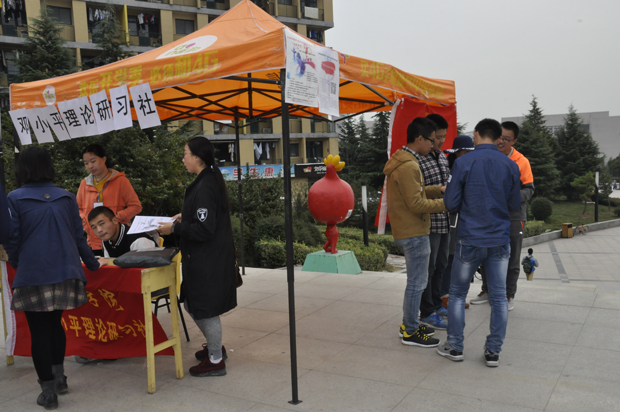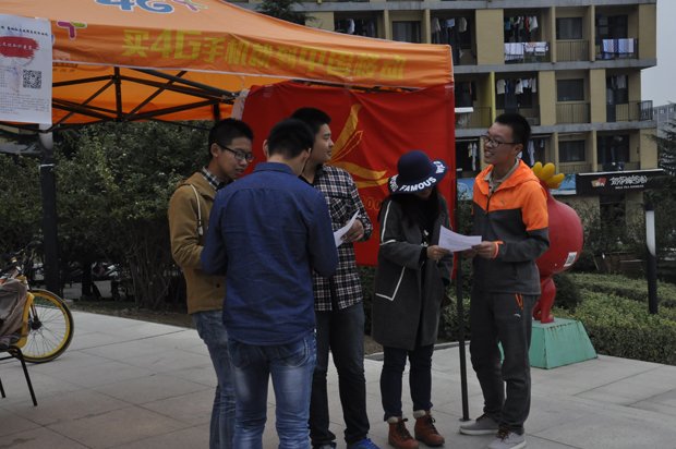上午,推广活动早早拉开序幕。安全学院知行社负责“抗战胜利70周年”对联征集大赛的推广,通过简单的对联,来表达心中对祖国的热爱,对先烈的崇敬之情,对祖国强大的自豪感;管理学院邓研社负责红色文化知识竞赛的宣传,以知识竞赛,来考验同学们对红色经典的了解程度;而化工学院真理学社则负责“光影声色”活动的介绍,通过抗战电影配音和听歌识曲等方式,呼吁同学们品味经典,勿忘国耻、振兴中华。到了中午,前来咨询的同学越来越多,安全学院知行社的同学都耐心逐一地讲解活动的相关内容,以及参与纪念抗战胜利活动的意义,推广活动持续火热地进行中。
