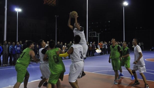 比赛前队员们个个激情满怀,积极做好准备。晚上8点比赛准时打响,双方球员迅速投入比赛,个个雄姿英发,你来我往一轮轮进攻防守场面火热,潇洒的投篮,飘逸的突破,赢来掌声雷动。在比赛的前两节孙越崎学院抓住了很多机会取得了领先,但是安全学院不甘落后,临阵不乱,在丁琦磊同学带领下拿下多次反击,渐渐的将比分拉平,最终反超。最后一节双方队员都情绪高涨,观众亦激情四射,啦啦队也喊得气势磅礴,在场边拉起了加油牌、彩球,敲打着手中装有石子儿的矿泉水瓶为场上的队员呐喊助威,现场的气氛十分活跃。随着裁判哨响全场比赛结束,双方队员互相握手致意,体现了他们对对手的尊重,增加了彼此之间的友谊。