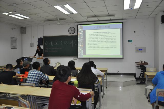 晚上六点,参加此次培训的所有成员到达指定地点,记者站站长贺子玲从新闻的格式、内容、篇幅等几个方面进行了说明,并且对近一个月的新闻进行了针对性地点评;然后就具体问题进行了举例说明,像出席,顺利举办,圆满成功等词汇应谨慎使用。接着指出照片中存在的问题并且做了详细的说明,这也是近一个月新闻采写过程中存在的最大的问题。会议末节,各部长对近期的工作做了相关的点评,并且鼓励中心的每一位成员要积极认真的工作,与此同时努力学习,争取工作学习两不误。培训会期间,部员们仔细听讲并且做了笔录。会后,部员与各部长就学习生活中的问题进行了密切的交流。