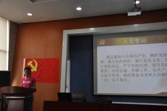下午3:30,会议正式在矿业科学中心A200室召开。会议第一项是举行新党员和“七一”老党员宣入党誓词活动。在入党宣誓仪式高亢的国际歌伴奏下,全体党员起立并面对党旗进行忠诚地入党宣誓,随后来自13级的刘煜君和12级的付艳晴分别讲述了自己在党的领导下,如何在学习和生活中践行党的要求,并使得自己变得更加优秀的历程。