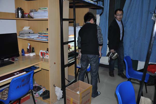 晚9点,会议准时开始。郑老师首先给大家通报说明了近期学校出现的安全问题事件,并希望同学们从自身做起认真对待安全问题。随后他又向同学们强调了晚点名的重要性,要求每个班有专人负责晚点名并且要求将晚点名的情况及时上报。他还指出本科生宿舍是事故高发地,阳台上的废弃物以及大功率用电器是同学们宿舍里的安全隐患,因此他强调员工不得私自在宿舍乱拉电线,不能使用电炉子、电吹风、电热杯等加热电器设备。对于同学们宿舍里存在的隐患,郑老师安排多组同学逐一检查宿舍,要求大家严格按照规范加以整改,发现问题,拍照逐一登记。在郑文奇老师的安排下,9点25各组同学开始检查舍。在检查过程中同学们对宿舍各个角落进行细致认真的检查,并对有问题的宿舍进行登记,同时要求宿舍人员尽快清除安全隐患。