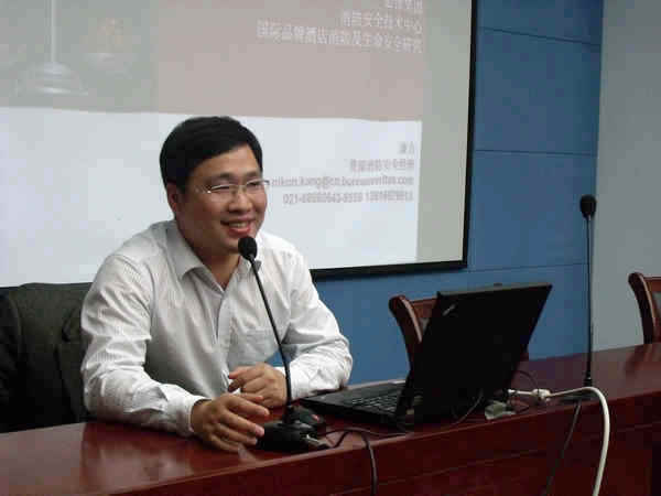 在讲座中,员工康力就目前担任的必维集团消防安全技术中心资深经理的相关工作,首先向大家介绍了奢华酒店高火灾风险、酒店行业发展迅速、中国房地产市场方兴未艾、境外酒店管理集团在中国蓬勃发展等酒店消防生命安全的行业背景。接着,他就奢华酒店消防及生命安全核心的相关技术要求,向同学们做了详细的介绍。在探测报警、自动灭火、防火分隔、应急电源、火灾响应及联动以及安全疏散等酒店消防的主要环节,康力员工利用大量的实物资料图片和图表数据,让同学们很快就对酒店消防的要点和现状有了生动直观的了解。