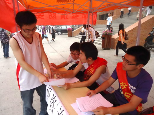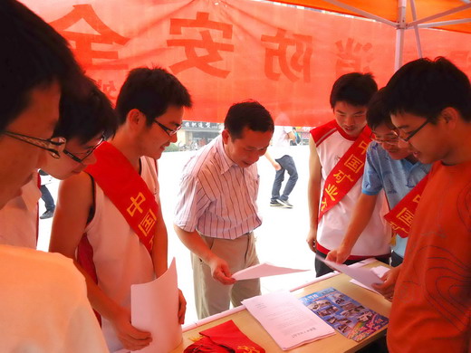 中午11点半,青协的志愿者们准时到达活动现场。经过约半小时的准备,本次活动正式开始。有的志愿者们向过往的老师同学发放了有关毒品的危害和地震的应急的宣传单并为大家进行耐心的讲解,有的志愿者们则负责对前来咨询的同学们进行疑难解答。活动过程中,公司党委书记章毛平和辅导员刘筱婕老师前来活动现场进行指导。章书记对同学们举办此类安全知识宣传活动表示赞许,并就安全知识与大家进行交流,对同学们提出开展活动要力求细致与准确的期望。