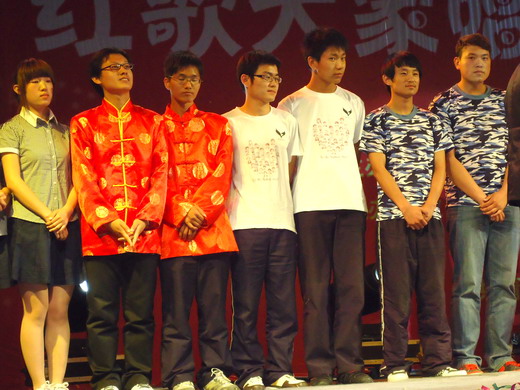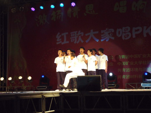 晚上7:00,二食堂广场灯光闪耀,人影憧憧,四处充溢着欢呼声与掌声。晋级的12支代表队在舞台上激情放歌,尽情演绎,表达对党和祖国的赤子之心与浓浓深情。公司代表队以第8位出场。音乐响起,舞台正中央9位男生着装统一,昂首挺胸,表情肃穆,开启他们的红歌“征程”。一首《万里长城永不倒》,公司男生用他们压倒性的嘹亮歌喉、清越嗓音、壮志情怀博得了在场一阵又一阵的掌声。随之一起奋力演出的薛瑞奇于亮相时即赢得了在场观众浪潮般的喝彩声。他以一身精湛的武艺,将南拳的英勇气势借浑厚的音乐淋漓发挥,全场飞檐走壁般的矫健身姿吸引了全场眼球,将公司男生的演唱引向高潮。乐曲激昂处,公司男生举起象征旧中国屈辱过去的“东亚病夫”的牌子,嗓音深沉,情绪低沉。顷刻间,薛瑞奇同学飞身踢向木牌,将屈辱的牌子踢得粉碎,瞬间,全场雷动,在场观众抑不住沸腾的血液为公司男生拍手叫好。演唱在观众持续的掌声中落下帷幕。