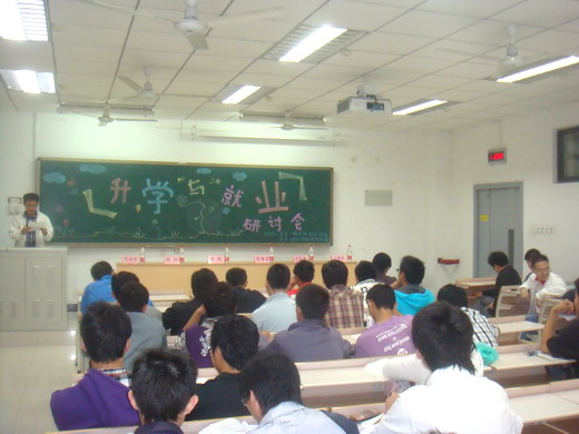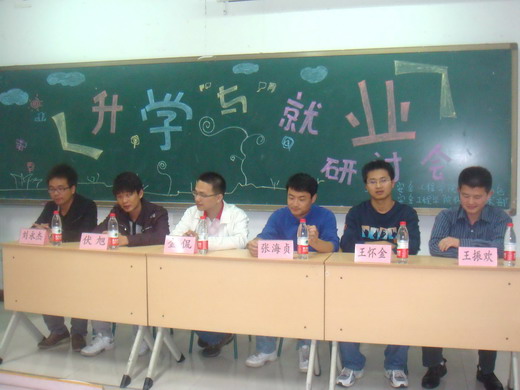 为更好地进行升学与就业方面的经验交流,2011年5月22日由公司创业协会和科技学术部共同举办的“升学与就业”研讨会于教五A201成功举行。本次研讨会邀请到了07级的刘永杰、伏旭、金侃等优秀同学作为嘉宾。交流会由何选择同学主持,公司各年级同学悉数参加。