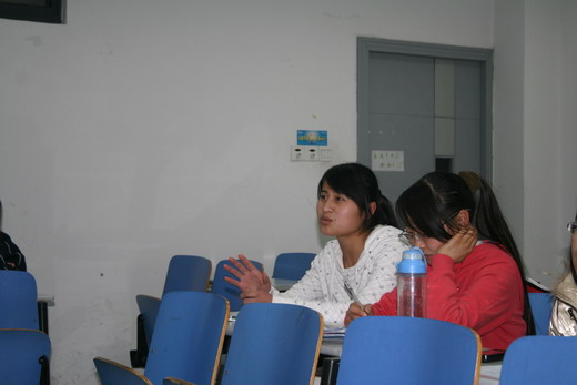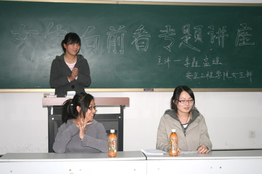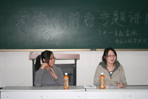 首先,两位女生进行了简单的自我介绍。李鑫,来自07级安全工程专业;孟瑶,来自07级消防工程专业,这两位女生都是公司的优秀员工,今年均获得了保送研究生资格。接着,她们两位就在座各位同学最关注的女老员工就业问题进行了详细的介绍和讲解。安全工程和消防工程两个专业的女生本科毕业之后,有一半都继续深造读研,有保送本校,也有保送外校。也有一部分女生走上了工作岗位,她们工作地方主要集中在江苏、浙江、山东等地,工作环境还不错,就业过程也没有想象的那么困难,李鑫和孟瑶的话语给在场的女生们吃了一颗定心丸。