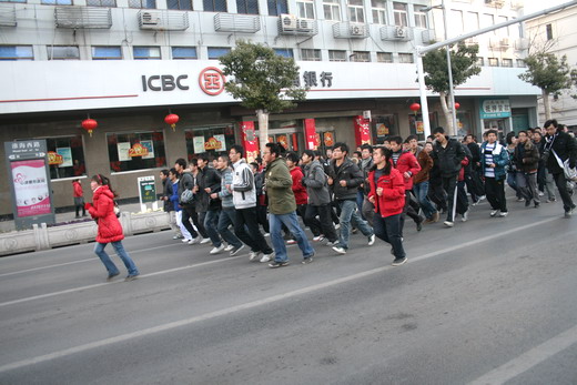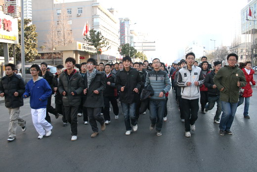 随后,83支百人方队从市体育中心出发,经由湖北路、苏堤路、西安南路、淮海西路、二环西路,最后返回体育中心。公司同学在刘筱婕、李成刚老师的带领下坚持完成了长达6000米的长跑,虽然途中天气严寒,但大家在辅导员的鼓励下一直坚持到最后。活动持续了一个多小时,公司同学圆满完成了此次长跑活动,最后集体在体育中心合影留念。