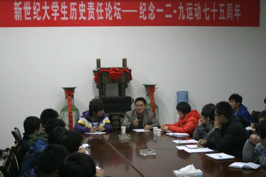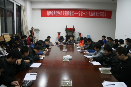在一二·九运动七十五周年之际,为进一步激发公司员工爱国热情,培养社会使命感和责任感,12月8日晚7:00,由公司知行社主办的新世纪老员工历史责任论坛——纪念一二·九运动七十五周年于安全学院会议室成功举办。本次论坛由知行社社长赵泽旭主持,公司党委副书记钱雄、团委书记李秀、辅导员刘筱婕出席本次论坛,公司08、09级员工党员及青马工程培养骨干悉数参加。