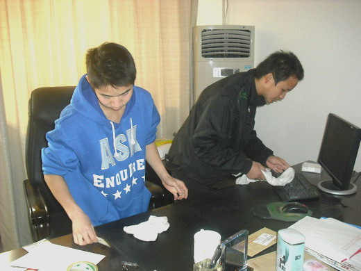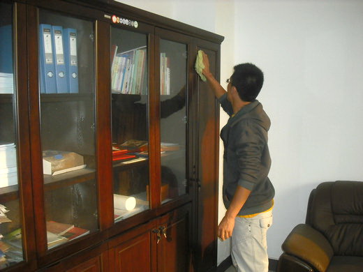 下午三点,服务分队D、E两组的成员来到公司办公楼。组长周红振和罗叶波简单的工作安排后,20余名服务分队成员两三个人一组,分散到十余个办公室。你擦桌子,我扫垃圾,大家立刻热火朝天的忙了起来。活动中,队员们一丝不苟地清扫着地面,包括每一个角落和每一处容易被忽视的地方。接着,队员们又将凌乱的桌椅摆放整齐,将办公桌上杂乱的文件和书籍归类整理。队员们不怕脏不怕累,彻底清扫卫生死角,将服务分队的奉献精神表现得淋漓尽致。安全10-3班的罗剑飞同学一直干得特别起劲,挥着一双还来不及洗的手兴奋地说:“感恩节刚刚过去,总想为老师们做些什么。像今天这样,为老师做点实事,是最有意义的!”在队员们一个多小时的努力下,办公室和会议室的面貌焕然一新,窗明几净。