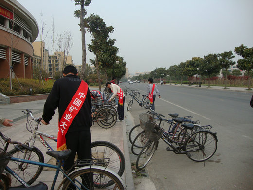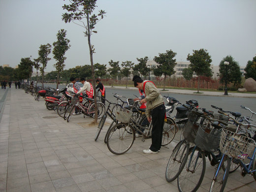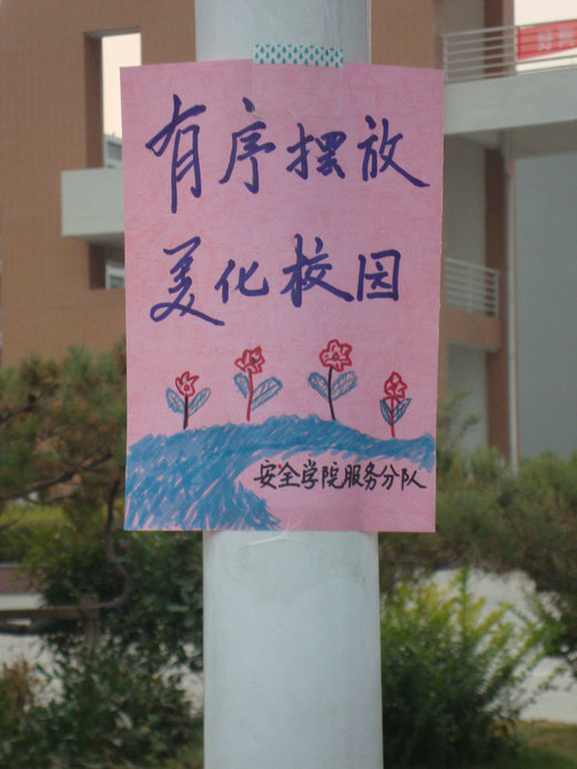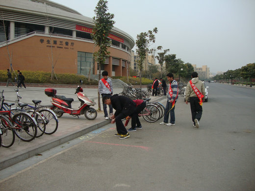 下午4点整,A组成员准时集结完毕,组长姜宁向组员们介绍了活动要求并分配了任务。活动正式开始后,队员们首先把路边乱放的自行车摆正位置,清理了路道上的垃圾,规划了停车区域和行人路口,张贴了自制的宣传画和告示。打理完毕后路边自行车摆放恢复整洁,后来的同学在停放自行车时也都注意了停车位置,曾经出现的自行车挡道的现象消失了,大家也按标语上的提示文明行路。三食堂的交通恢复了原有的顺畅现象。