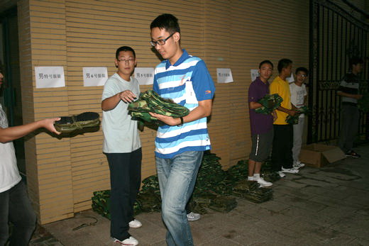 在公司10级辅导员孙留涛、刘筱婕、李成刚老师的带领下,10级新生于五点四十就在竹苑3号楼东门前排列着整齐的队伍,等待领取他们的军训服装。每一位新生都按照工作人员的安排依次有序地领取到军训服、帽子、鞋子。在仔细清点自己是否全部拿到军训服后,很多新生就迫不及待地试穿衣服。