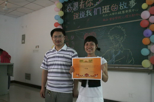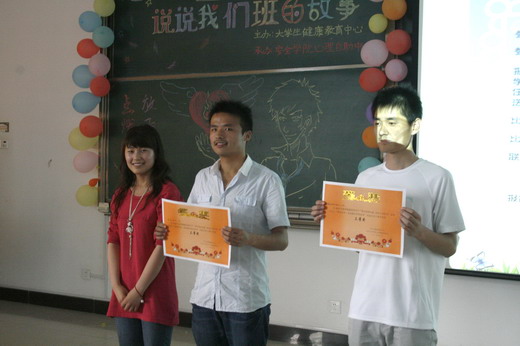 各班级展示结束后,公司心理健康自助中心指导教师李秀老师对本次比赛进行精彩的点评并对“感恩有你”活动主题进行深刻的诠释:“感恩有你”的“你”既是我们每个人自己,又是身边的朋友、同学,更是班级这个大家庭,正是因为这些,我们的生活才如此的丰富多彩。最后,主持人当场公布了比赛成绩并由评委颁奖。地质09-1班荣获一等奖,消防09-1班与英语09-6班获二等奖,安全09-1班与科技09-1班获三等奖,数学08-3班、过控09-2班、交运09-2班、建筑08-1班、工商09-1班获得鼓励奖,比赛就此圆满结束。通过本次班级风采大赛不仅调动了各参赛班级的创造积极性,而且在提高班级凝聚力的同时,展现了班级积极向上的风貌,为塑造一个健康向上、感恩有爱的校园提供了美好的机会。
